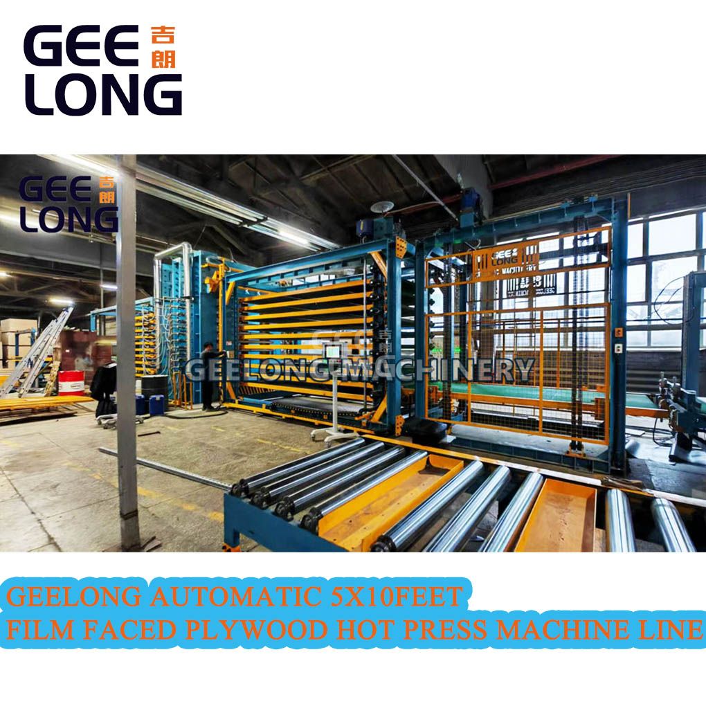 Geelong Automatic 5x10feet Film faced plywood hot press machine line, well designed and produced by Shandong geelong machinery equipment Co., Ltd. consist of each parts of this production line, powered roller conveyor, board lifter machine with powered roller, vacuum loader, pre paving belt conveyor with electrostatic device for film faced paper and plywood, longitudinal belt loader, 5x10feet film faced plywood hot press machine, automatic belt unloader, automatic stacking machine, board lifter machine with powered roller, powered roller conveyor for outlet(RGV plywood transport car...etc.), geelong machinery is very professional company in produce automatic film faced plywood hot press machine, we set up so many good lines out of China, all lines are satisfied by our clients, welcome to inquiry if you are needing this film faced plywood hot press machine automatic model.